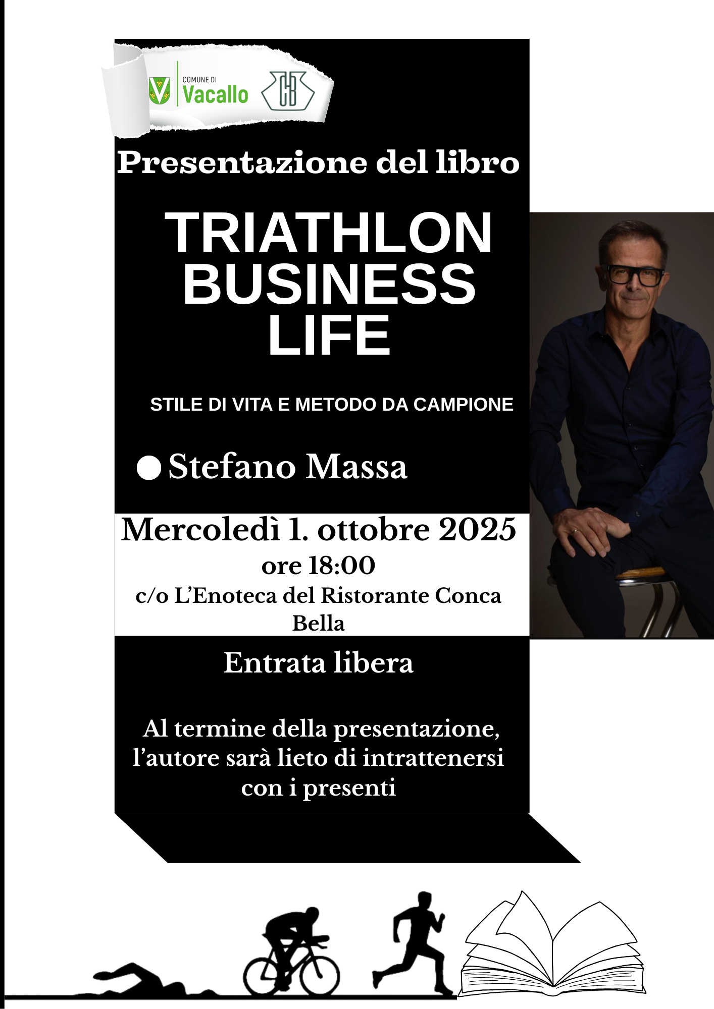 Ab 18 Uhr wird in unserer Enoteca das Buch "Triathlon Business Life - A Champion's Lifestyle and Method" von Stefano Massa vorgestellt, ein Werk, das Sport, Karriere und Lebensphilosophie miteinander verbindet und wertvolle Einblicke bietet, um den täglichen Herausforderungen mit Disziplin und Weitblick zu begegnen.